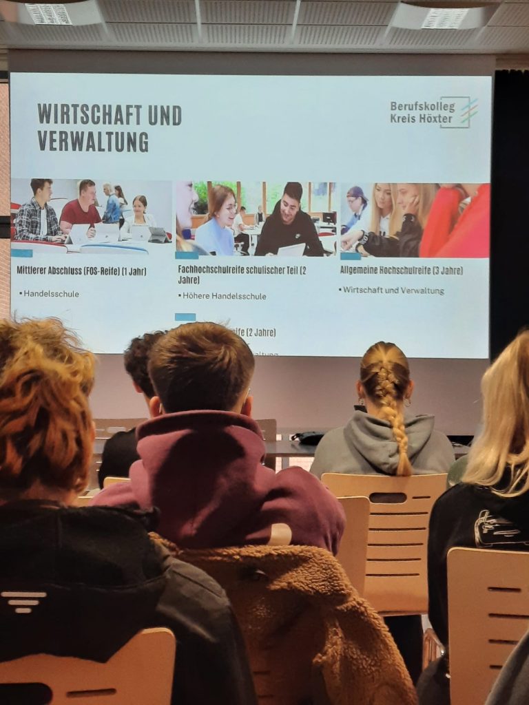 Am heutigen Montag wurde der Jahrgang 10 unserer Schule über die Möglichkeiten für den schulischen und beruflichen Werdegang, welche das Berufskolleg des Kreises Höxter in Brakel bietet, informiert.